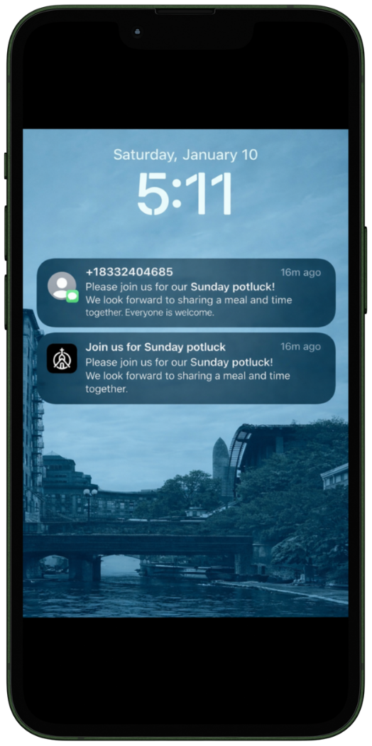 Reach your church instantly with texts and push notifications that stay in sync with your events and content.